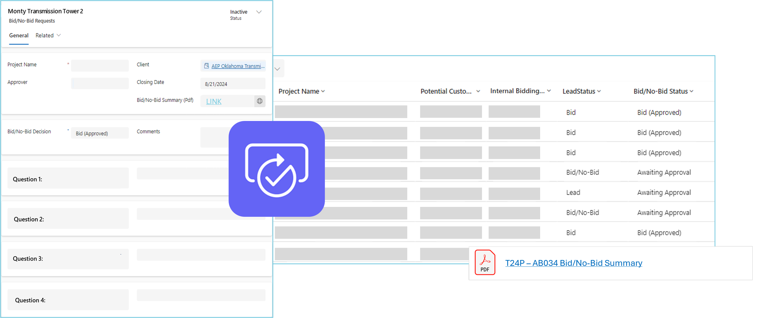 Easily send Bid/No-Bid request to required distribution lists with auto-generated Bid Summaries. leadership can quickly review key information about an opportunity and make a data driven decision. Ensure you are considering all factors by adding questionnaires to Bid/No-Bid approvals.